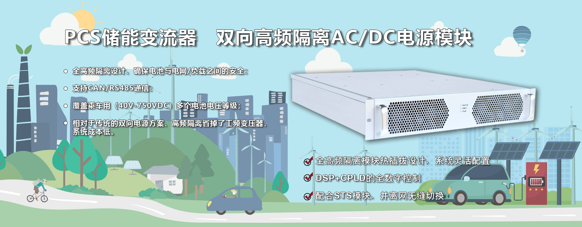 三相五線制(3W+N+PE),支持離網(wǎng)不平衡負載; 配合PCS模塊,可實現(xiàn)并離網(wǎng)無縫切換,確保重要負載不間斷供電; 模塊化設計,安裝與維護簡單; 模塊結構緊湊,功率密度高。
